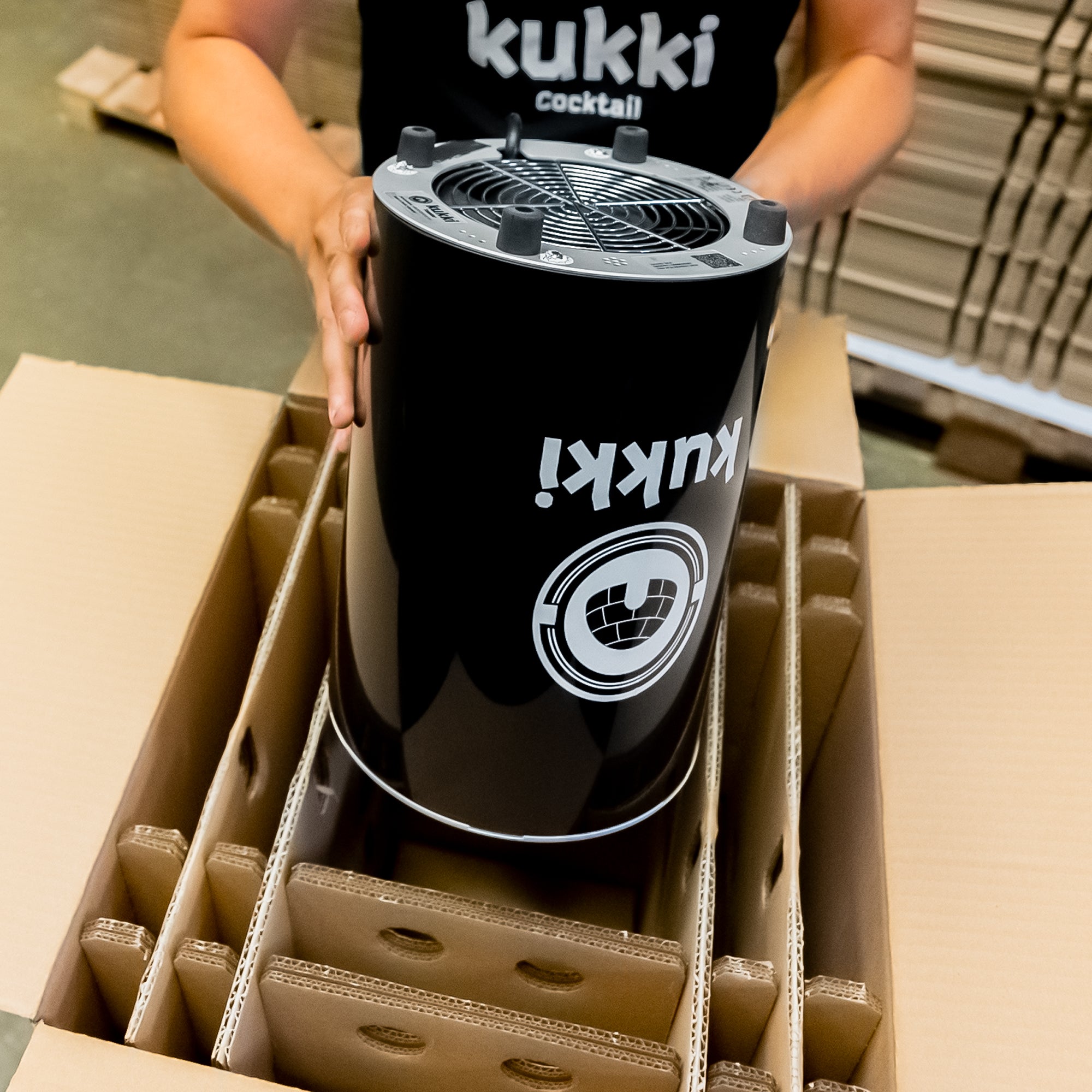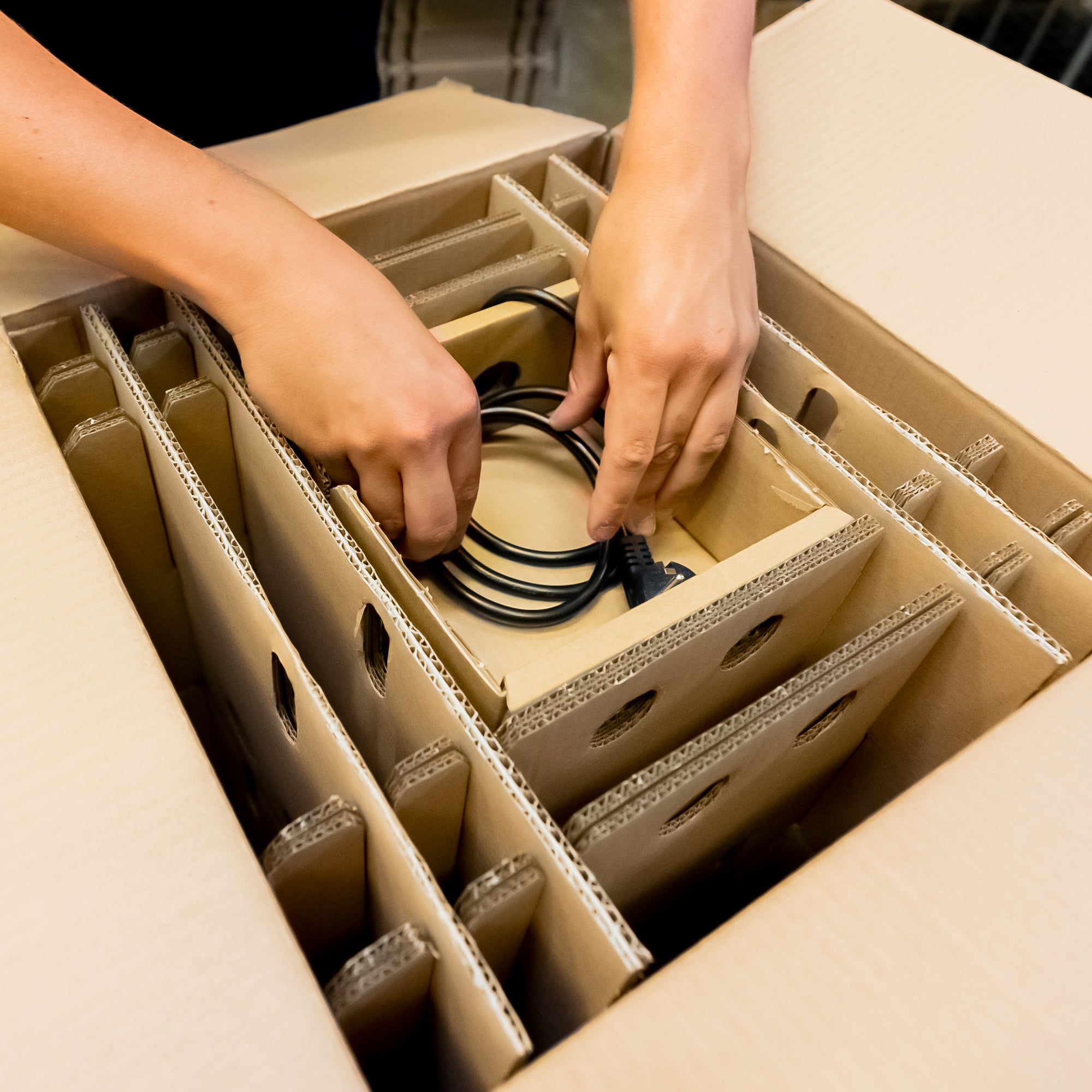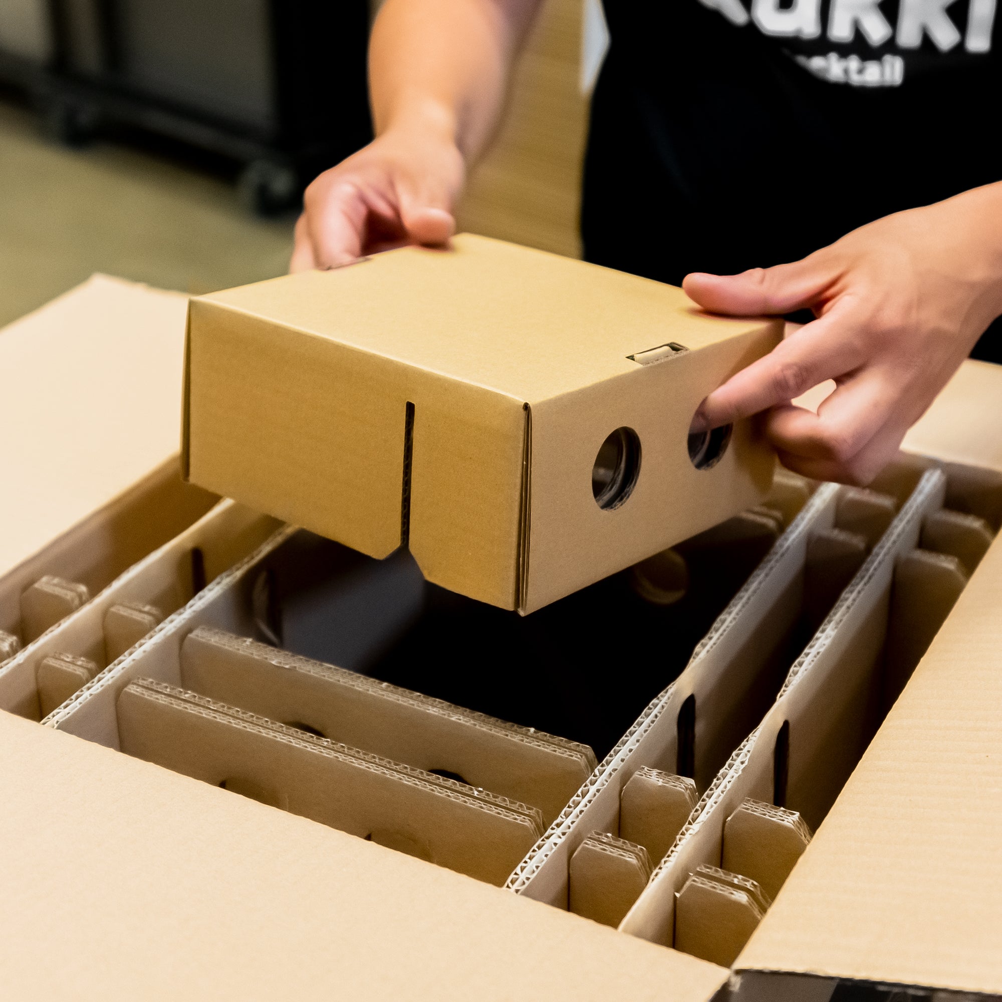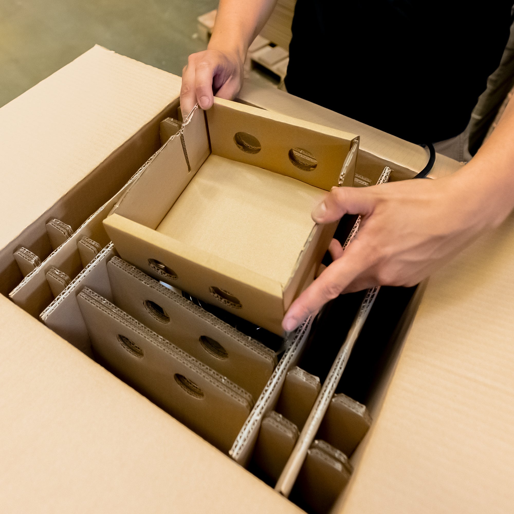 Lege das erste Podest mit der Öffnung nach unten in den Karton